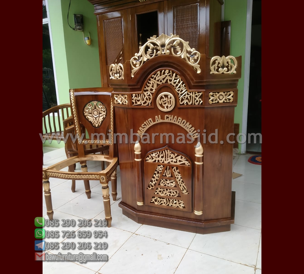 Jual Podium Masjid Al Charomain dari kayu jati pilihan hasil tangan pengerajin profesional dengan harga murah. Dan anda bisa memesannya secara online yang mudah, aman dan terpercaya. Tentu saja untuk pememesanan secara online sangat mudah, aman dan terpercaya dengan cukup menghubungi customer servise yang tersedia.