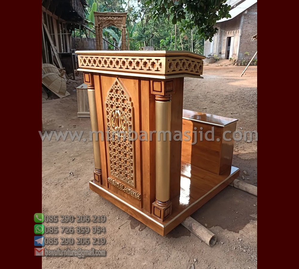 Diolah menggunakan kayu jati mutu terbaik dengan konsep minimalis model terbaru yang sangat modis dan kekinian. Dimana memiliki tambahan ornamen arabic dan juga lafadz ALLAH yang membuat desainnya terkesan lebih Islami. Serta dilapisi dengan finishing melamine warna salak tua kombinasi emas yang membuatnya lebih elagan dan menawan. Sehingga akan sangat tepat untuk dijadikan sebagai sarana khutbah atapun ceramah saat pengajian akbar di masjid maupun musholah. Dan tentunya anda bisa memesannya secara online dengan mudah, aman dan terpercaya hanya di Bawu Furniture Jepara.