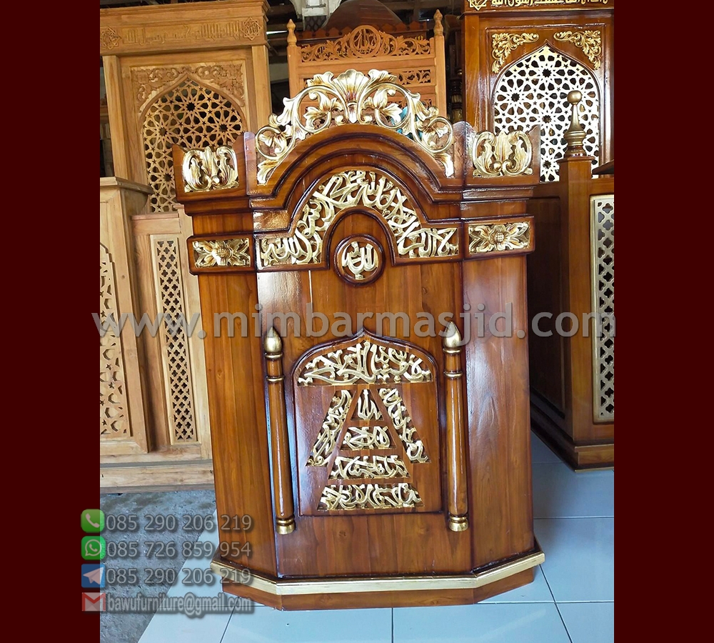 Model Podium Masjid satu ini merupakan salah satu pilihan terbaik untuk anda jadikan referensi dalam mencari sarana untuk ceramah. Baik untuk di masjid, mushola ataupun acara pengajian yang anda selenggarakan. Sebab model ini mengusung konsep ukir jepara yang memiliki tambahan sentuhan ukiran kaligrafi Al-Qur’an yang membuat desainnya terkesan lebih islami. Serta dilapisi dengan finishing melamine warna salak kombinasi emas yang membuatnya lebih elegan dan berkelas. Selain itu, produk ini dibuat menggunakan kayu jati kualitas bagus yang mana akan menjadikan kualuitas produk ini kuat, awet dan tahan lama. Untuk itu, pesan sekarang juga di Bawu Furniture Jepara derngan harga murah dan secara online.