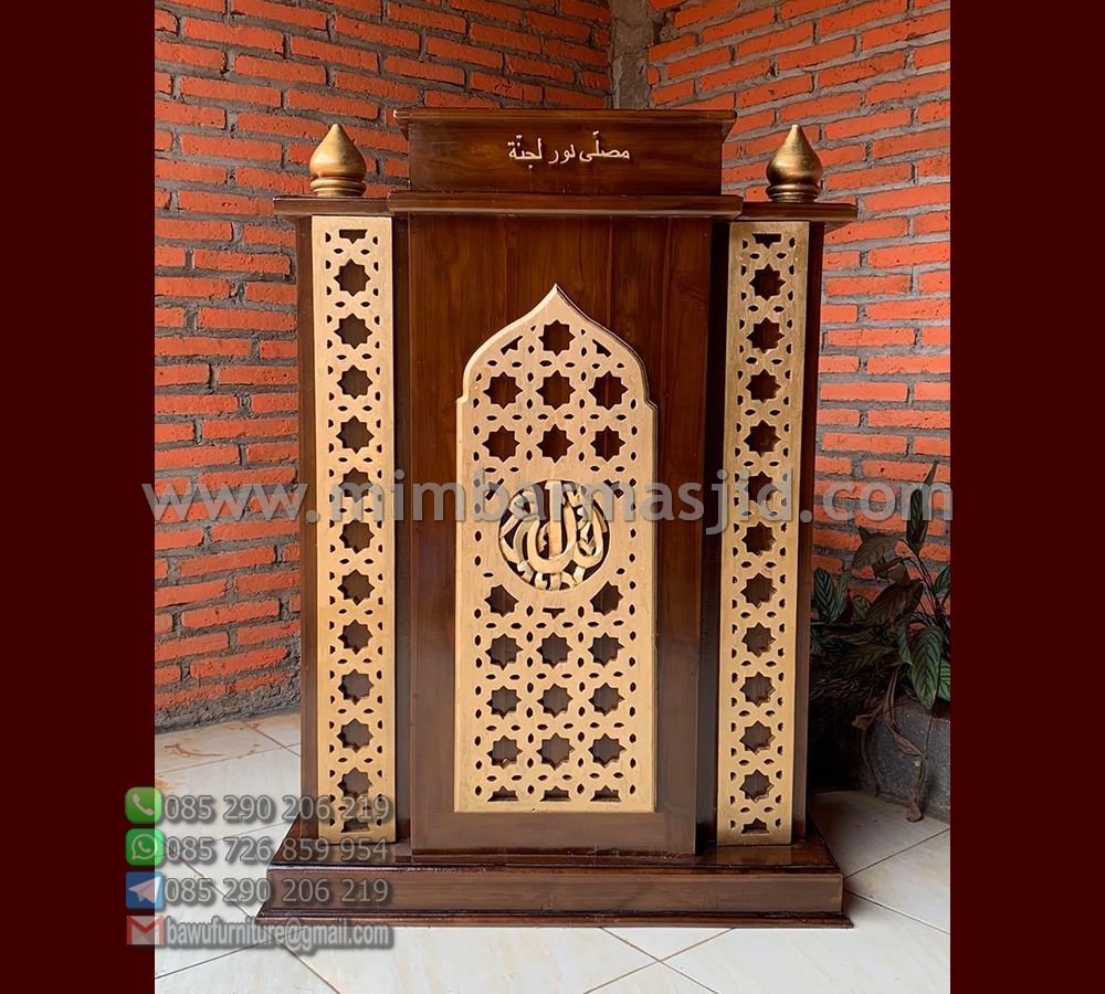 Dibawah merupakan salah satu varian terbaru dari model podium yang sangat cocok untuk menjadi furniture pada masjid ataupun mushola. Terlebih yang ingin menghadirkan kesan lebih modis akan suasana di dalam tempat ibadah tersebut. Sebab, model ini mengadopsi konsep minimalis model terbaru dari kayu jati kualitas bagus. Dimana desainnya simpel dengan tambahan motif ornamen arabic dan juga Lafadz ALLAH membuat Podium Masjid ini terkesan lebih islami. Tentu saja visualnya disempurnakan dengan lapisan finishing melamine warna salak tua kombinasi emas yang membuatnya semakin elegan. Sehingga akan sangat cocok untuk menjadi sarana ceramah atau khutbah pada masjid dan juga mushola di kota anda.